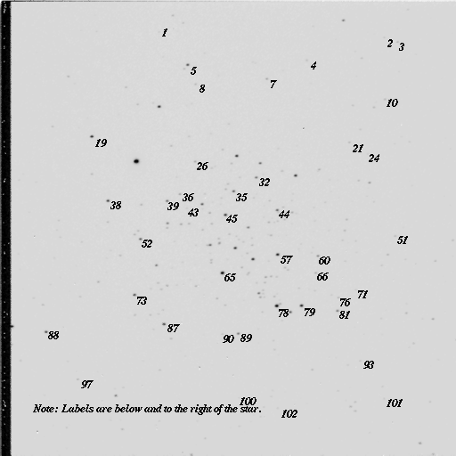 Open star clusters are groups of several hundred stars held together by gravity. All of the stars in a cluster are thought to have been born at the same time from a parent cloud of gas and dust. Many clusters are relatively young (less than ~108 years, young for stars!). A plot of apparent magnitude versus surface temperature (or, equivalently, color index) reveals a characteristic nearly diagonal line called the Main Sequence. Stars on the main sequence are still burning hydrogen in their cores.