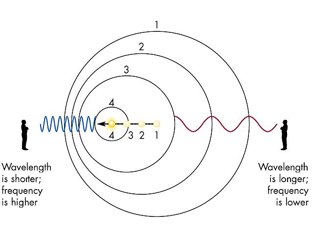 The Doppler Effect: Imagine that you are lying on the sofa, watching soaps. A fire engine comes down the street. While it's approaching you, the pitch of the siren is higher. While it's receding from you, the pitch of the siren is lower. If you could hear stars, they would do the same thing. The stars that are approaching you would have a higher pitch, and the ones that were going away from you would have a lower pitch.