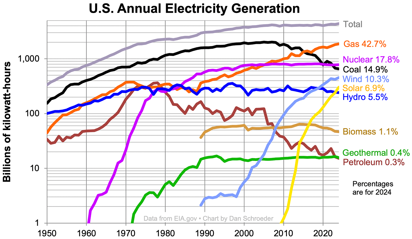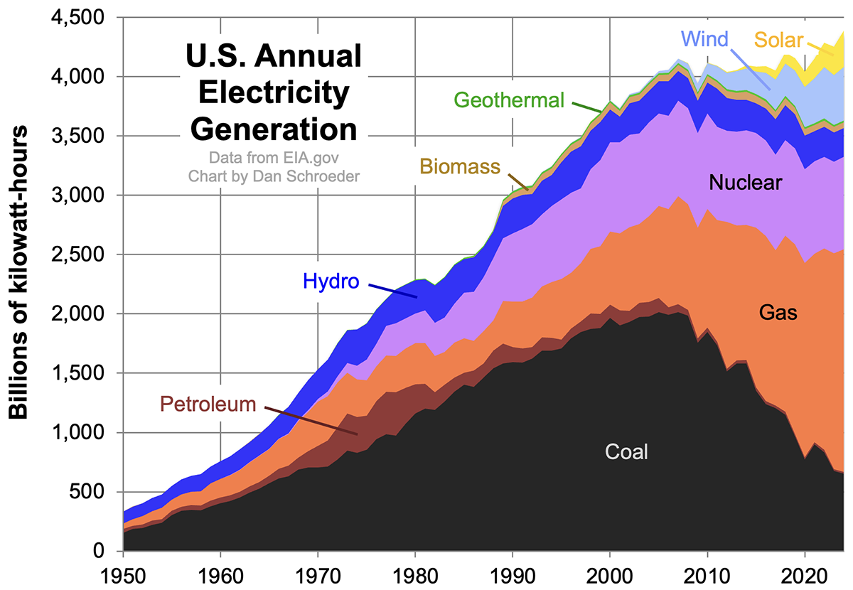 As you can see, America’s electric power sector has been rapidly changing, with coal use plummeting while gas, wind, and solar power increase. Here is a graph of total U.S. electricity generation, by source, from 1950 through 2024: