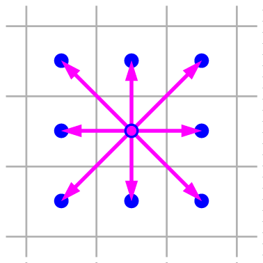 For simplicity I'll work in two dimensions, and discretize space into a square grid or lattice. Each lattice site is big enough to hold a large number of gas molecules, which will be moving in various directions due to their thermal motion plus any large-scale fluid flow. However, I will approximate this rich complexity by allowing only nine different velocity vectors, corresponding to nine elementary displacements during a unit of time: up, down, right, left, along any 45° diagonal, or zero (staying in place). The nine elementary displacements are illustrated and listed below, using a unit system in which the lattice spacing is one unit.